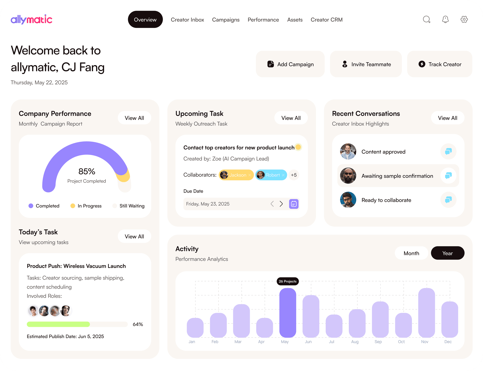 By automating outreach, tracking performance metrics, and identifying top-performing creators, allymatic helps you focus resources on what drives real results.